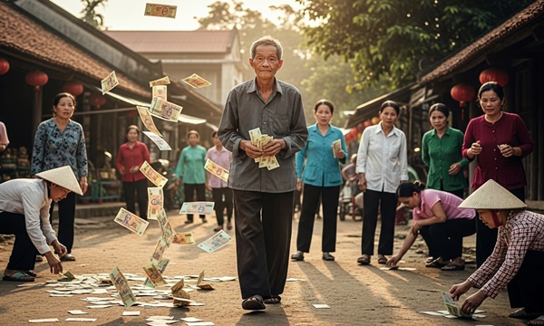 Giờ đây, giữa những đồng tiền rơi rớt khắp làng, chỉ còn lại hai mẹ con bàng hoàng, không biết phải làm sao để ngăn người đàn ông ấy – người từng là trụ cột, từng thương con như máu thịt – dừng lại trước khi rải nốt những gì còn sót lại trong đời mình….