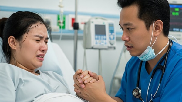 Minh bước ra khỏi phòng mổ, tháo chiếc khẩu trang đẫm mồ hôi. Hành lang vắng lặng, chỉ có một người đàn ông đang ngồi gục mặt. Là Hùng – chồng mới của Lan.