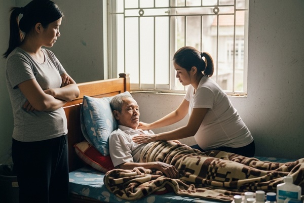 Nhiều lần, tôi thấy My lau mặt cho bố chồng, ông nhìn nó chăm chú, khóe mắt ánh lên tia cảm xúc lạ lùng. Một tối, tôi đi pha sữa cho con, vô tình nhìn qua khe cửa phòng ông – My đang ngồi sát mép giường, nắm tay ông, khóc nức nở.