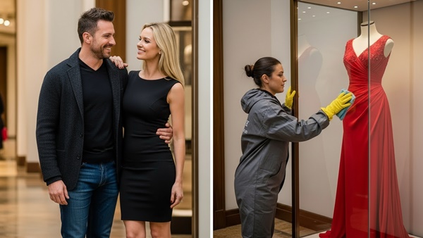 Mark let out a sharp, mocking laugh that drew stares from nearby shoppers. He pulled a few crumpled five-dollar bills from his wallet and tossed them onto the trash bin Claire was leaning near. “Looking is all you’ll ever do, Claire. A woman like you, working as a janitor… you couldn’t afford a single button on that dress if you saved for ten lifetimes.”