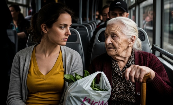 I was taking the bus home—the Route 49, which I took every Tuesday and Thursday after work. The bus was crowded, as it always was during rush hour, and I’d managed to snag a seat near the middle. At the next stop, an elderly woman got on, probably in her late 70s, carrying two heavy grocery bags and moving slowly with a cane. She was small and frail-looking, with white hair pulled back in a bun and wearing a worn coat that had seen better days.