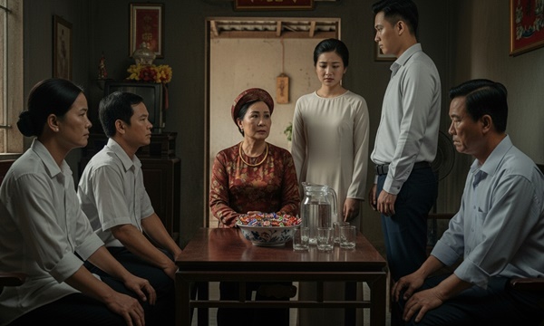 Nhưng giữa tiếng vỗ tay ấy, bà Dung chỉ thấy mình như bị tát vào mặt. Bà cúi gằm, chiếc kiềng 5 chỉ trên cổ cô dâu trở nên nhỏ bé và đáng xấu hổ đến lạ. Mồ hôi rịn trên trán, môi bà run run. Bà cố bám vào trai để không bị ngã.