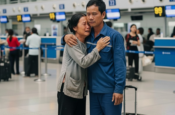 Mai tiễn chồng ra sân bay bằng đôi dép rách và nụ cười gượng. Cô đã phải vay 300 triệu — số tiền khổng lồ đối với người phụ nữ buôn rau ngoài chợ. Mai nắm chặt tay Hùng, nước mắt rưng rưng: “Anh cứ yên tâm làm việc. Ở nhà em lo được hết. Chỉ mong anh giữ lời, về mình làm lại từ đầu.” Để có 300 triệu cho Hùng đi xuất khẩu lao động, Mai đã phải vay nóng, cắm cả sổ đỏ nhà bố mẹ để lại.